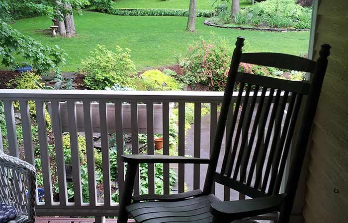 With lots of windows and beautiful views of the gardens, this spacious, one room suite features cathedral ceilings and a temperature controlled gas fireplace. There is a solid ash wood queen bed made by a local New England furniture maker, a full bath, and a fully equipped kitchenette that is stocked with coffee, cream, dishes, and an oven/microwave combo. The sofa can be transformed into a twin bed if needed. The room has its own private porch sitting area and entrance where, in warm weather, you can enjoy a quiet chat overlooking the gardens. Sleeps up to 3.